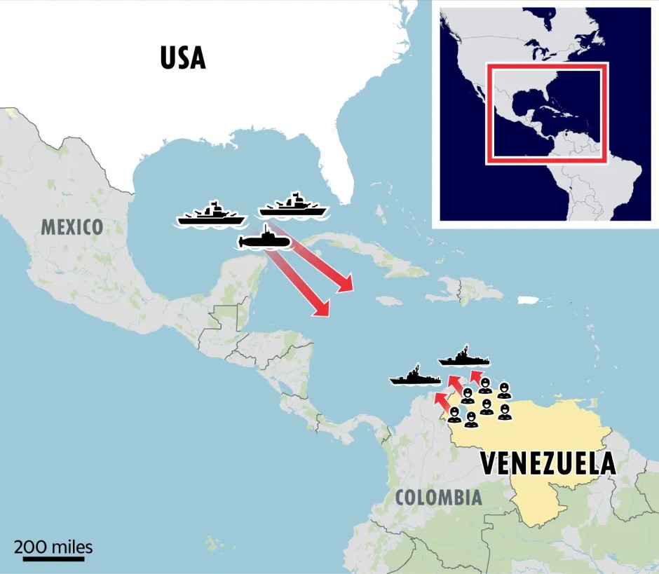 Son durum: ABD, uyuşturucu kaçakçılığını önleme amacında olduğunu söyleyerek Karayipler’e en az 7 savaş gemisi (USS Gravely, USS Jason Dunham, USS Sampson gibi destroyerler dahil) ve bir nükleer denizaltı konuşlandırdı.